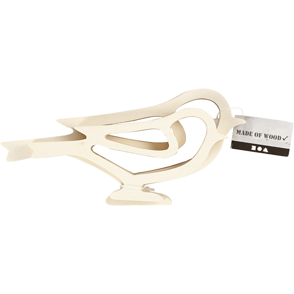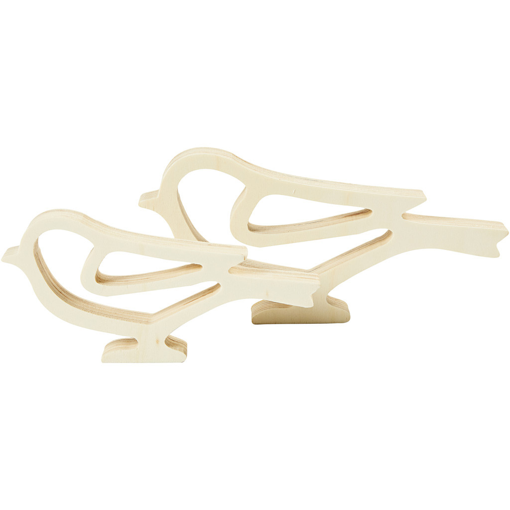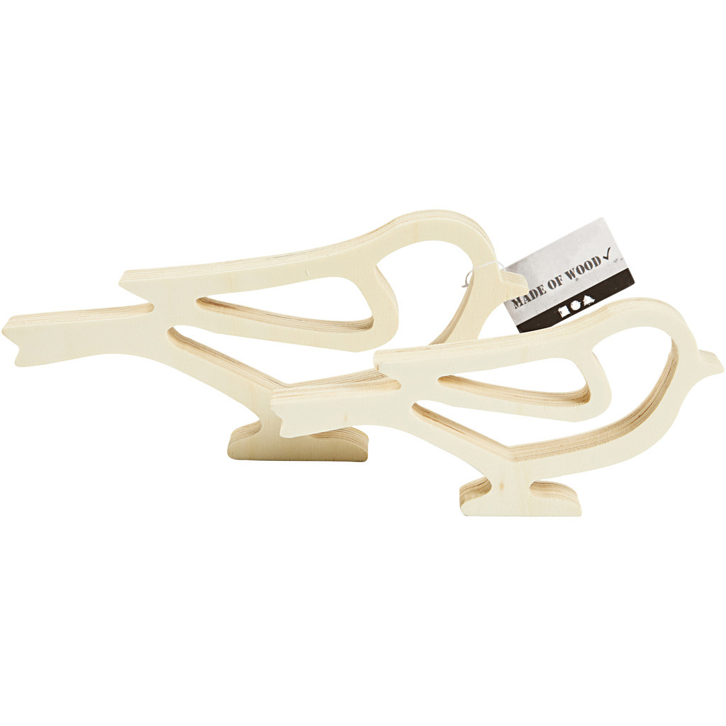 Set van 2 houten vogels in 2 verschillende maten. Beiden gemaakt van licht hout. h: 8 + 10 cm, l: 16,5 + 20,5 cm, diepte 2 cm